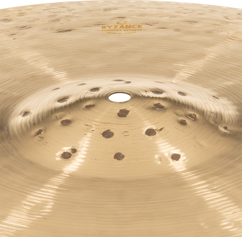 Extensive hand-hammering and fully lathed surface. Medium weight, full bodied sound with dark and explosive response that decays quickly. Great as a light ride too.