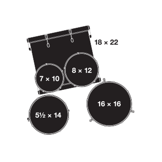 7-ply Maple ketel - 30° bearing edge - 2.3 mm steel hoops - Chrome hardware - Incl. Double tomholder - 10"x7" TT / 12"x8" TT / 16"x16" FT / 22 x18" BD / 14"x5,5" SD - No Cymbals.